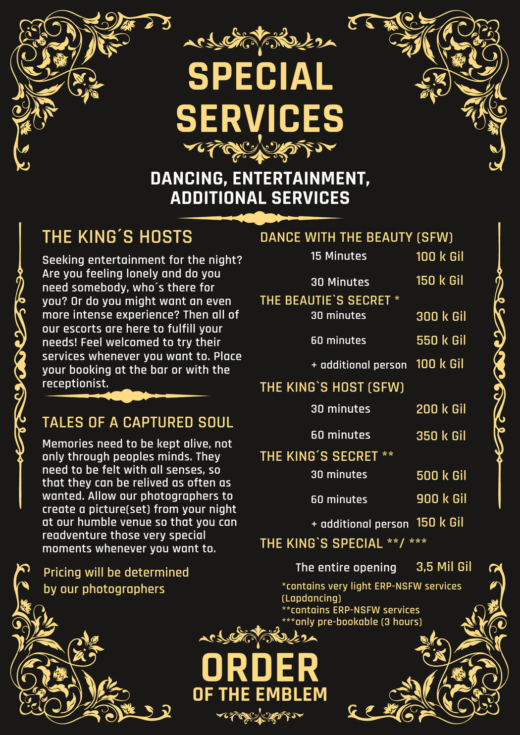 Dive deep into the secrets of the Order, discover our rentable rooms created to please your most sinful needs. Share them with strangers or rent them just for you and your partner. Just ask our booking manager or the owners and we´ll give you the price. Note: You´ll recieve a free room of choice when booking our hosts services. Rentable rooms will be marked with (R).